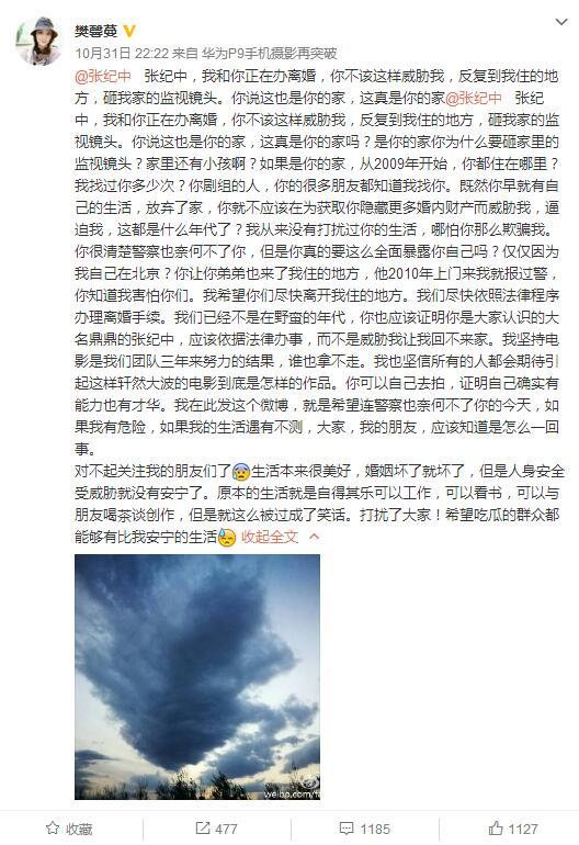 張紀(jì)中,我和你正在辦離婚,你不該這樣威脅我,反復(fù)到我住的地方,砸我家的監(jiān)視鏡頭。你說(shuō)這也是你的家,這真是你的家。張紀(jì)中,我和你正在辦離婚,你不該這樣威脅我,反復(fù)到我住的地方,砸我家的監(jiān)視鏡頭。你說(shuō)這也是你的家,這真是你的家嗎?是你的家你為什么要砸家里的監(jiān)視鏡頭?家里還有小孩???如果是你的家,從2009年開始,你都住在哪里?我找過你多少次?你劇組的人,你的很多朋友都知道我找你。既然你早就有自己的生活,放棄了家,你就不應(yīng)該在為獲取你隱藏更多婚內(nèi)財(cái)產(chǎn)而威脅我,逼迫我,這都是什么年代了?我從來(lái)沒有打擾過你的生活,哪怕你那么欺騙我。你很清楚警察也奈何不了你,但是你真的要這么全面暴露你自己?jiǎn)???jī)H僅因?yàn)槲易约涸诒本??你讓你弟弟也?lái)了我住的地方,他2010年上門來(lái)我就報(bào)過警,你知道我害怕你們。我希望你們盡快離開我住的地方。我們盡快依照法律程序辦理離婚手續(xù)。我們已經(jīng)不是在野蠻的年代,你也應(yīng)該證明你是大家認(rèn)識(shí)的大名鼎鼎的張紀(jì)中,應(yīng)該依據(jù)法律辦事,而不是威脅我讓我回不來(lái)家。我堅(jiān)持電影是我們團(tuán)隊(duì)三年來(lái)努力的結(jié)果,誰(shuí)也拿不走。我也堅(jiān)信所有的人都會(huì)期待引起這樣軒然大波的電影到底是怎樣的作品。你可以自己去拍,證明自己確實(shí)有能力也有才華。我在此發(fā)這個(gè)微博,就是希望連警察也奈何不了你的今天,如果我有危險(xiǎn),如果我的生活遇有不測(cè),大家,我的朋友,應(yīng)該知道是怎么一回事。